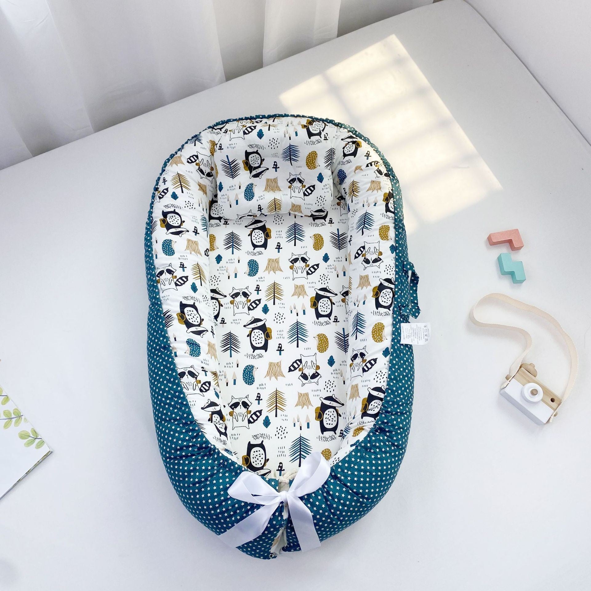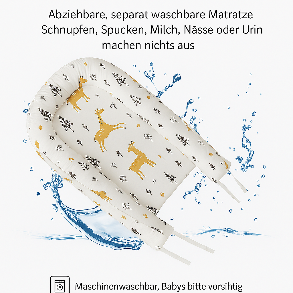 Das weiche Babynest ist maschinenwaschbar und bleibt formstabil – perfekt bei kleinen Missgeschicken wie Milch, Urin oder Spucke. Der Bezug ist abziehbar, schnell trocknend und sanft zur Babyhaut. Für ein sauberes, sicheres Schlafgefühl.